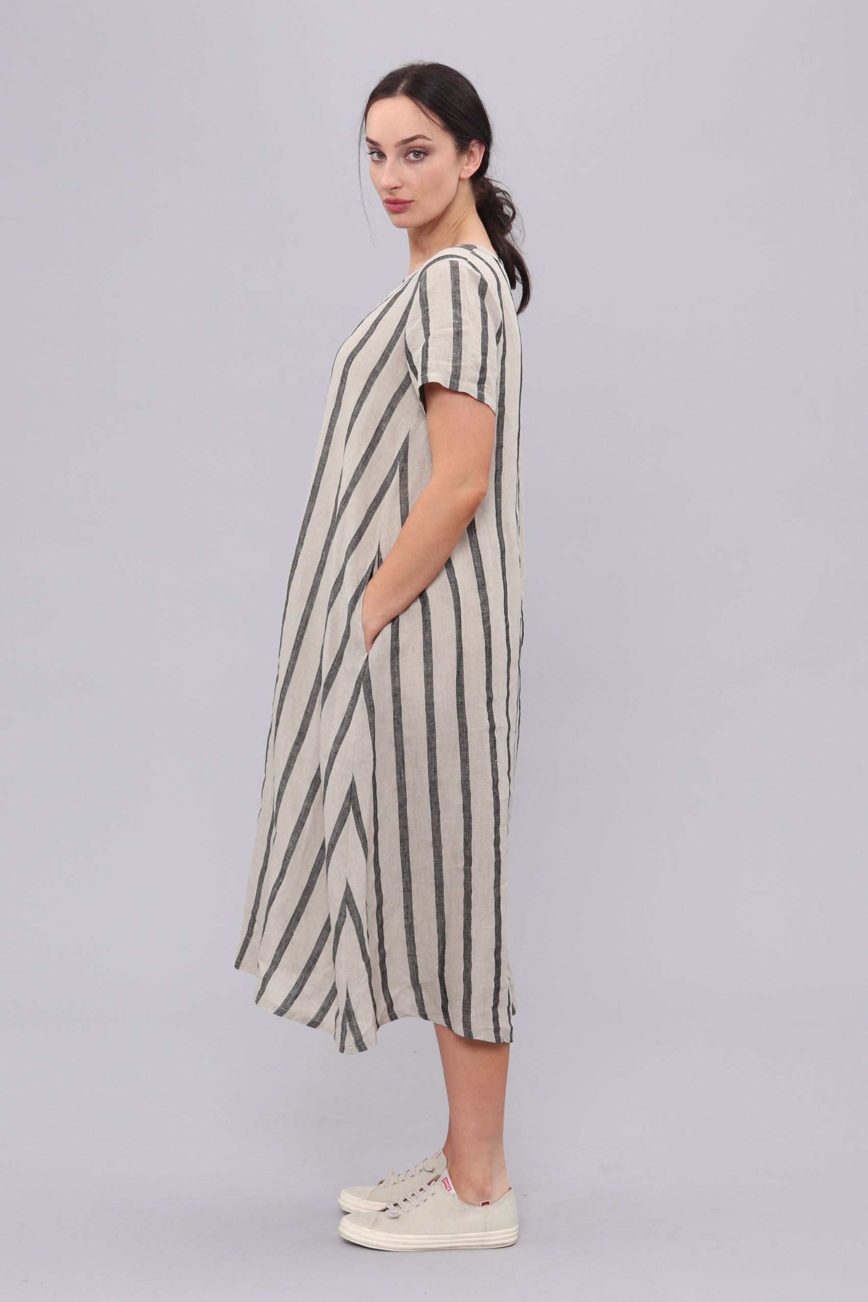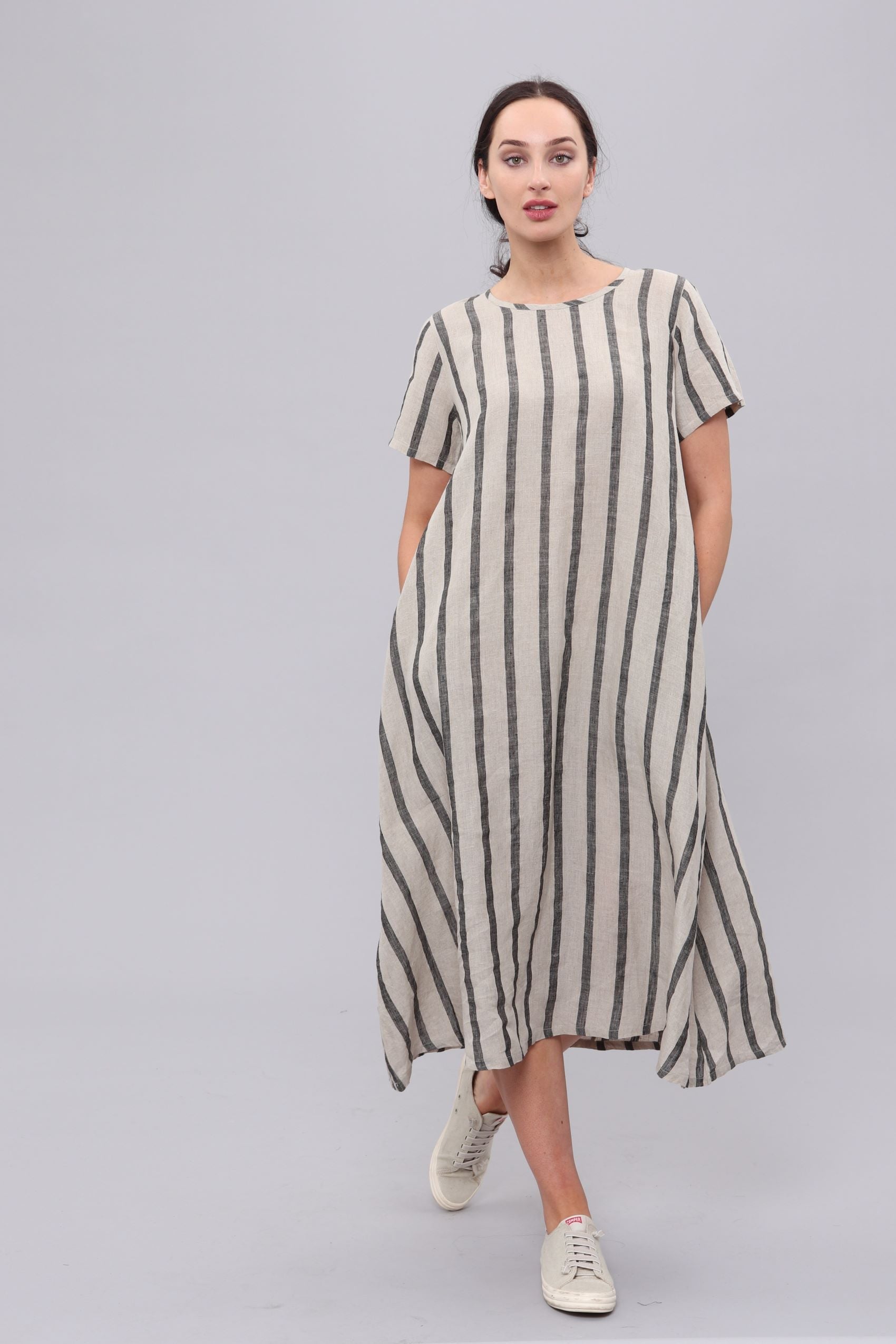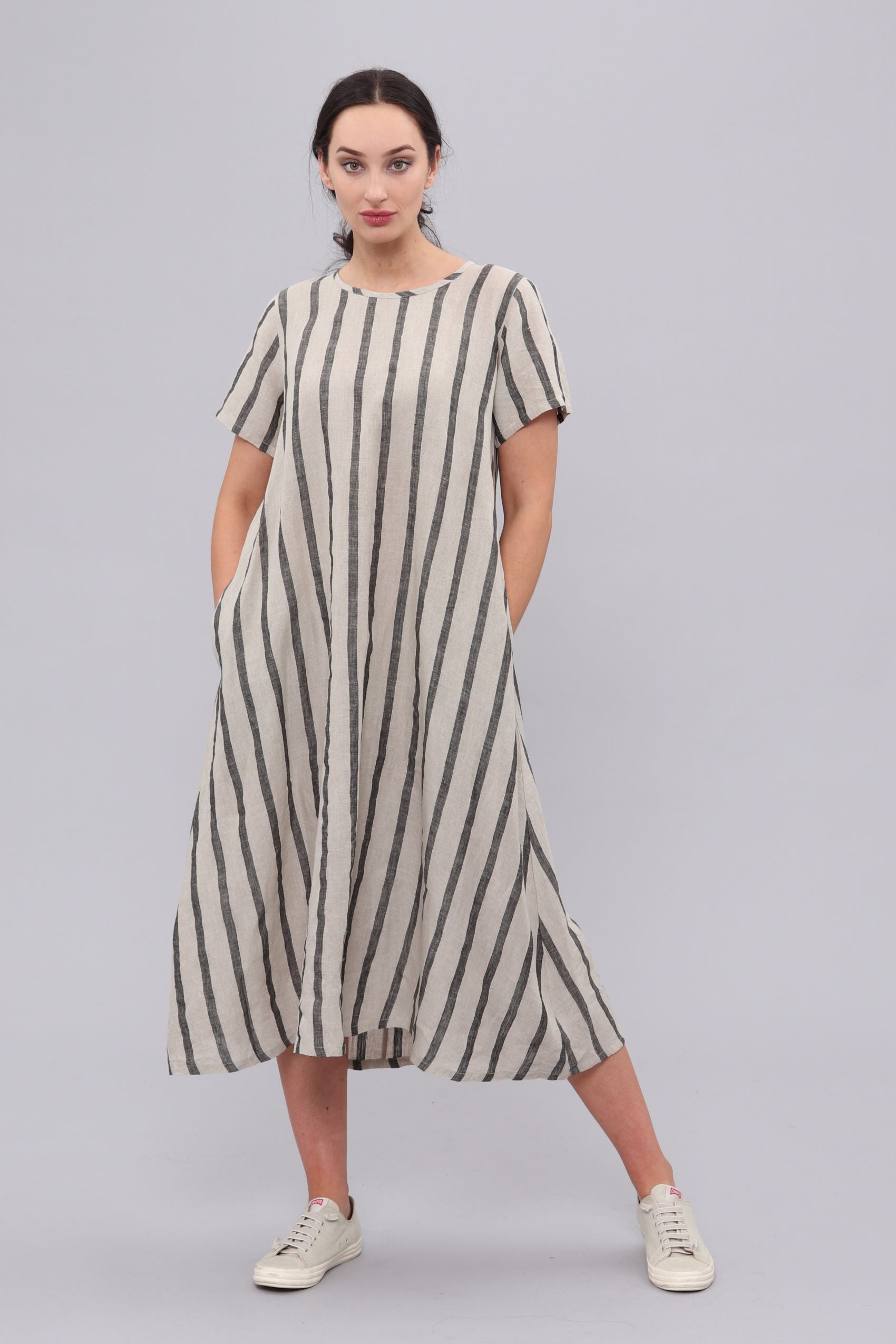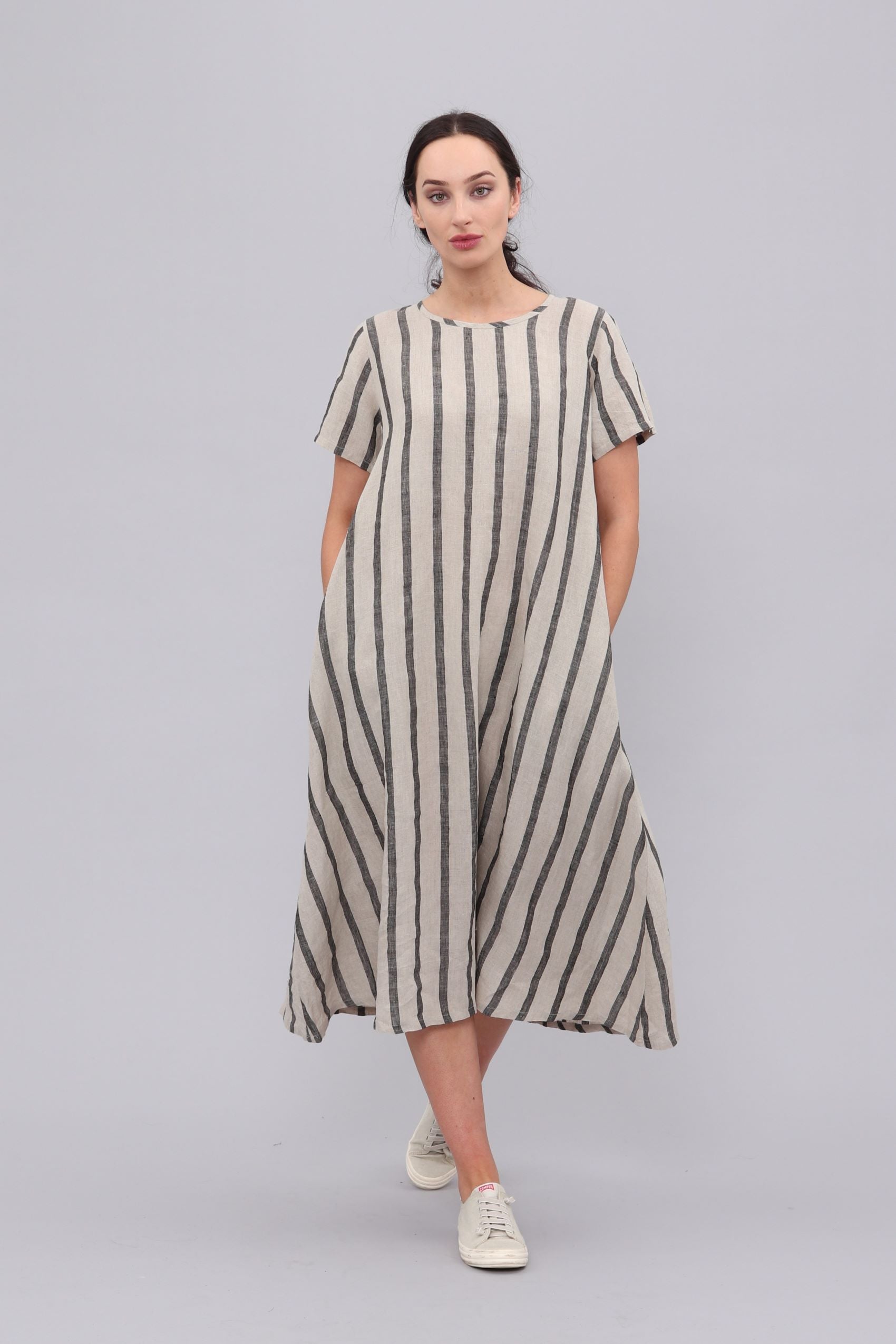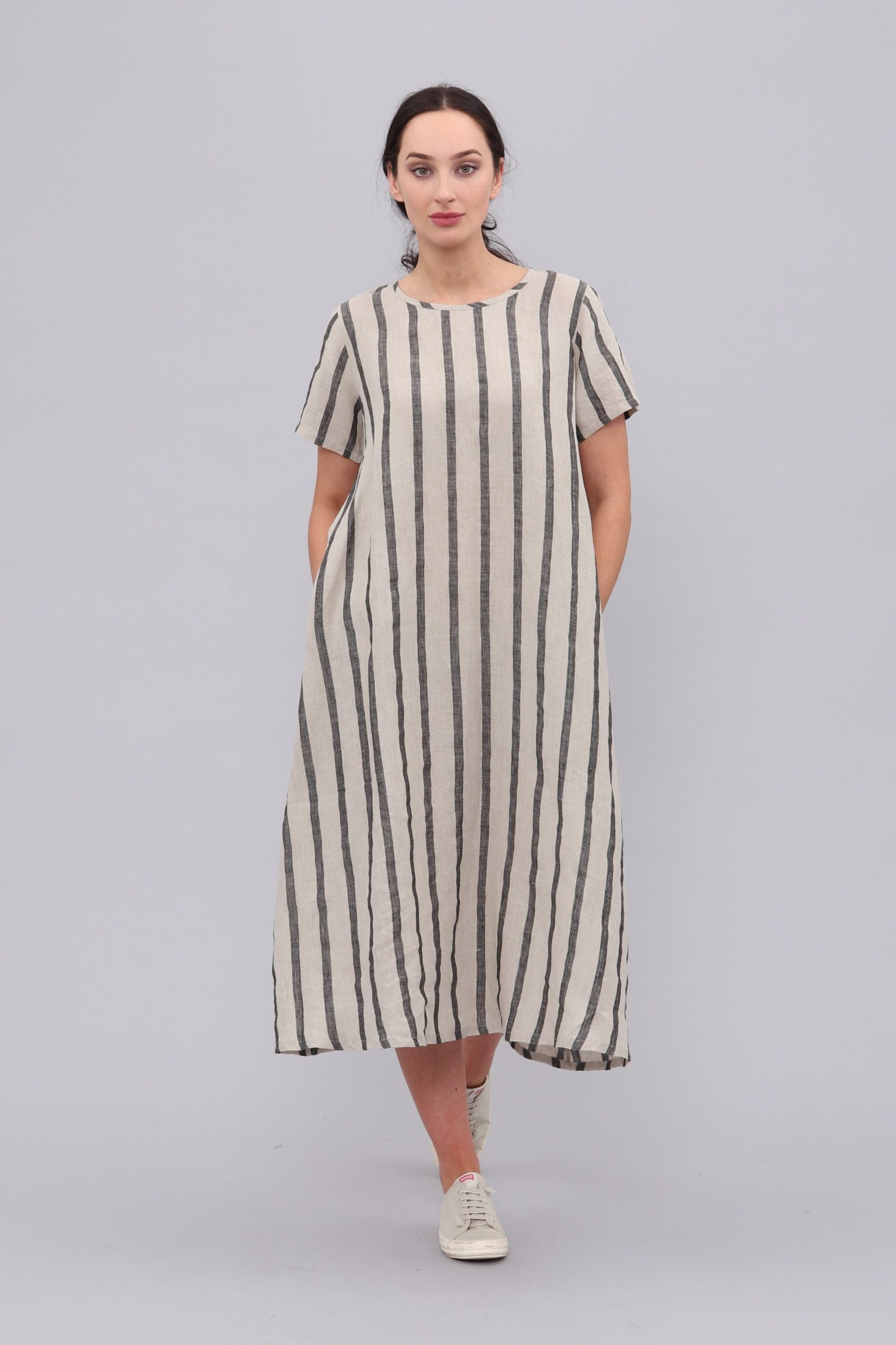 100% Organic linen short sleeve A-line maxi dress, stripe, natural/black.