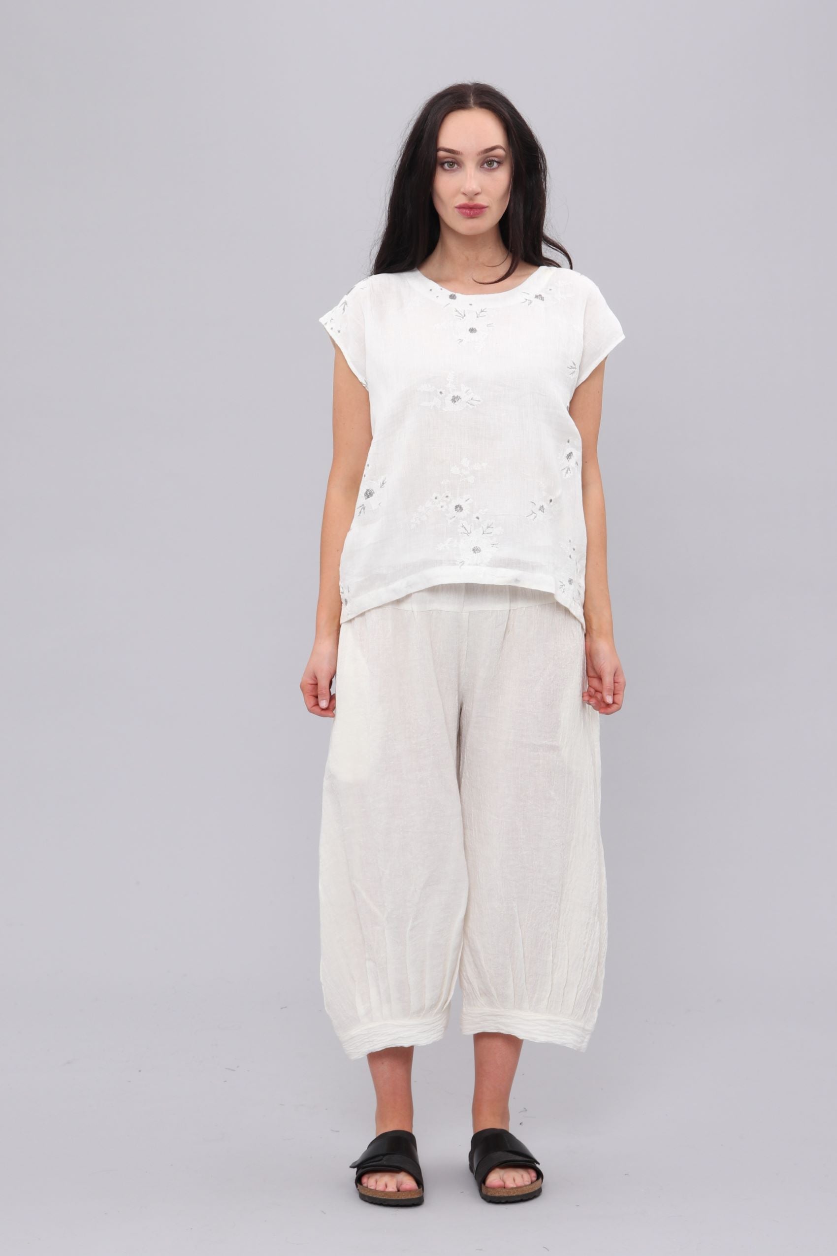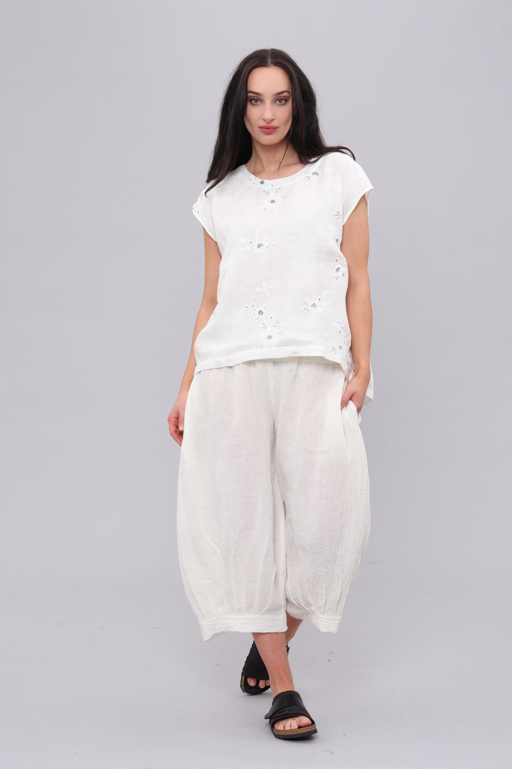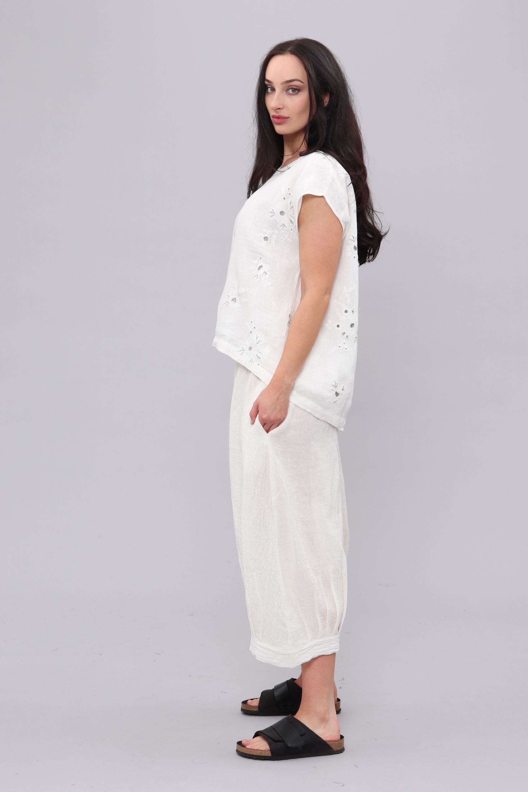 Elastic waist pants with yoke and full leg, cuff on bottom of leg.